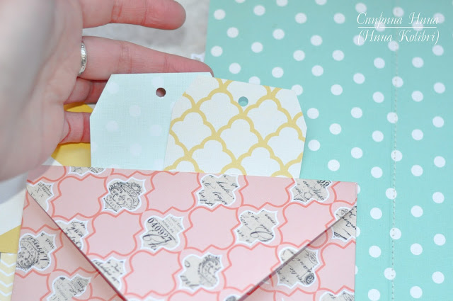 Внутри конвертик, а за конвертом кармашек с тегами: